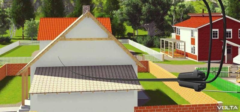 Можно снова поднять кабель по стене дома на высоту минимум 2 м. При использовании данного способа рекомендуется кабель прокладывать в металлической трубе прямо от траншеи до распределительного щитка.