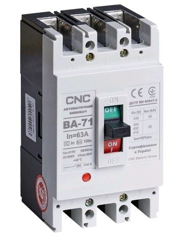 Корпусный силовой автоматический выключатель с номинальным током 10А А производства CNC Electric тип ВА-71 предназначен для защиты электрических сетей переменного тока частотой 50 Гц и напряжением 400 В от перегрузки и токов короткого замыкания. Также, автомат может быть использован для нечастых оперативных включений и отключений электрических сетей на промышленных и бытовых объектах. Как и другие корпусные устройства, он устанавливается на монтажную панель в щит при помощи болтов. Напряжение питания переменного тока может подаваться как со стороны верхних, так и со стороны нижних контактов. Монтаж, настройка и подключение должны осуществляться только квалифицированным электротехническим персоналом.