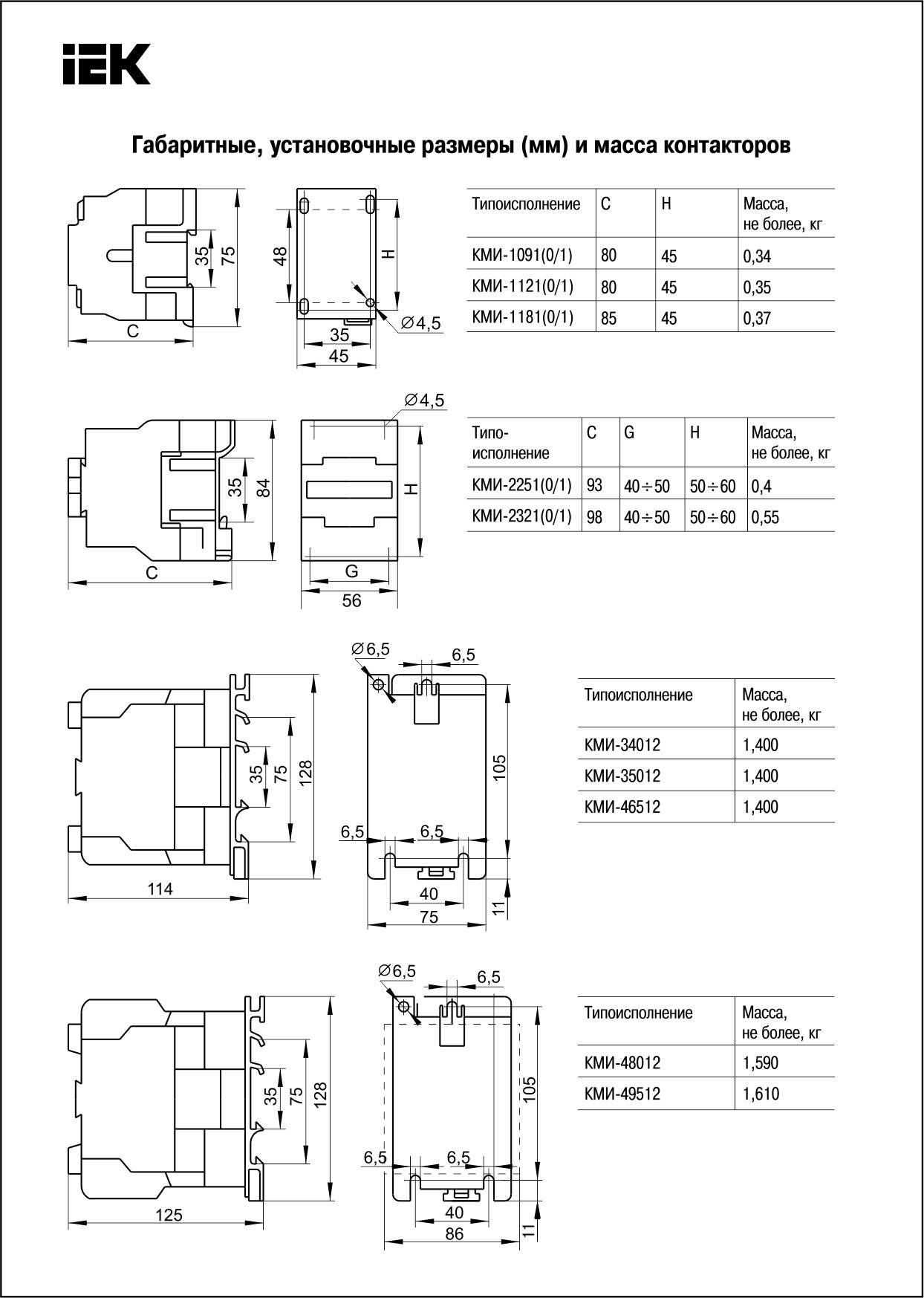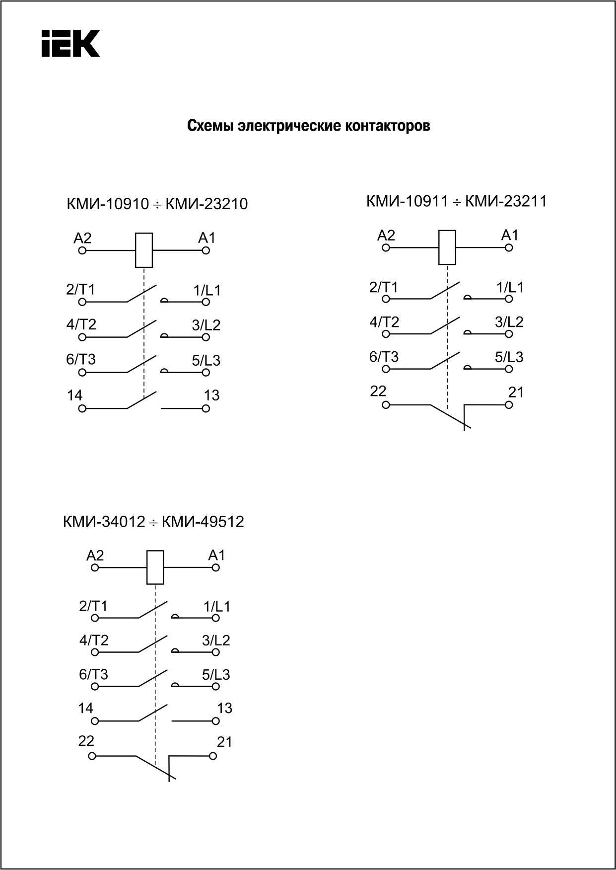 Малогабаритные контакторы переменного тока общепромышленного применения КМИ на ток нагрузки от 9 до 95 А предназначены для пуска, остановки и реверсирования асинхронных электродвигателей с короткозамкнутым ротором на напряжение до 660 В (категория применения АС-3), а также для дистанционного управления цепями освещения, нагревательными цепями и различными малоиндуктивными нагрузками (категория применения АС-1). Все исполнения на ток нагрузки до 40 А имеют одну группу замыкающих или размыкающих дополнительных контактов. Исполнения на ток нагрузки свыше 40 А - две группы (замыкающую и размыкающую).